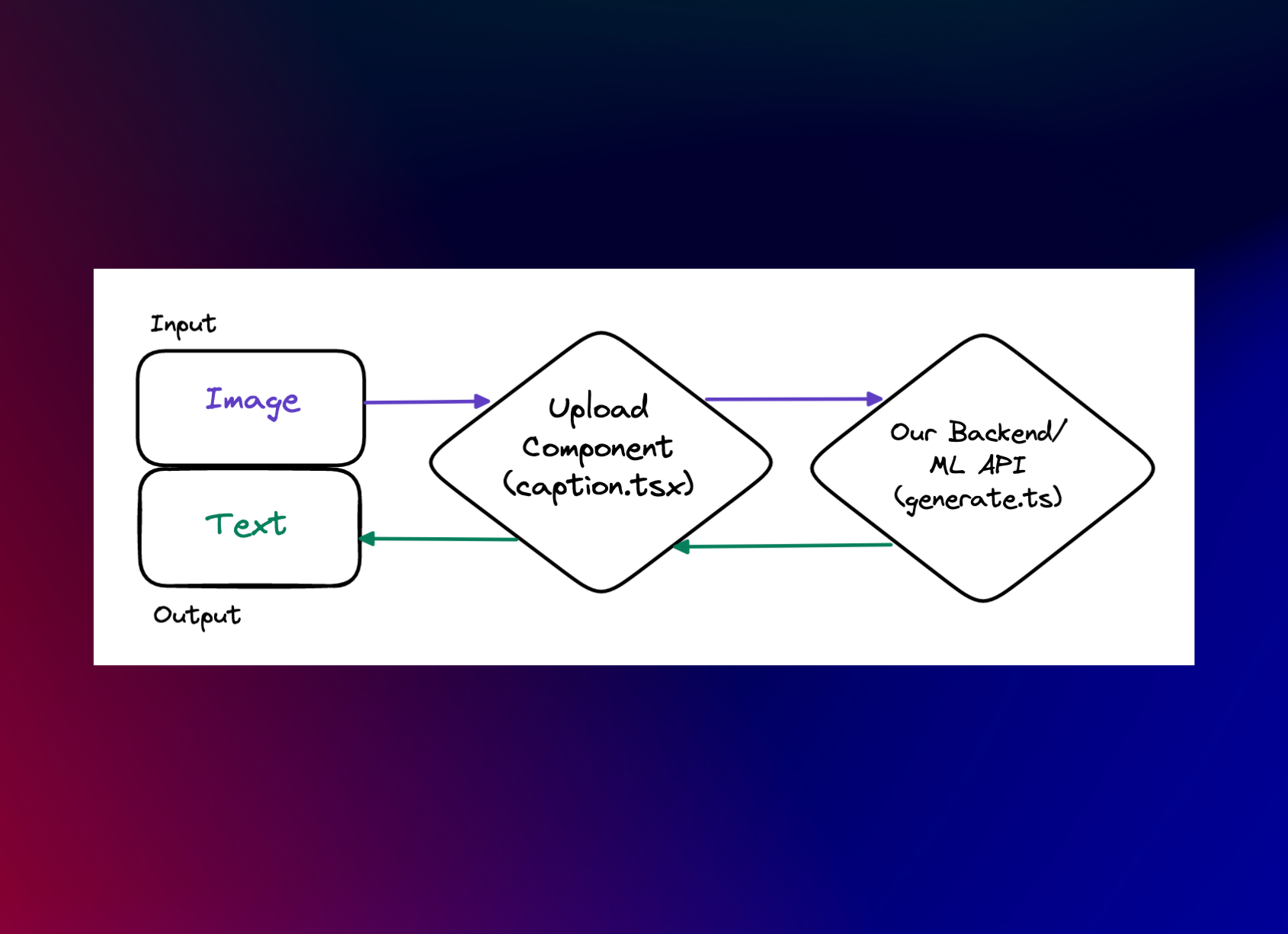 This is a high-level diagram of how data is flowing. Our input, the user-uploaded image, goes through the Upload Component, to the backend for BLIP ML API processing and then displays the response text in the UI.