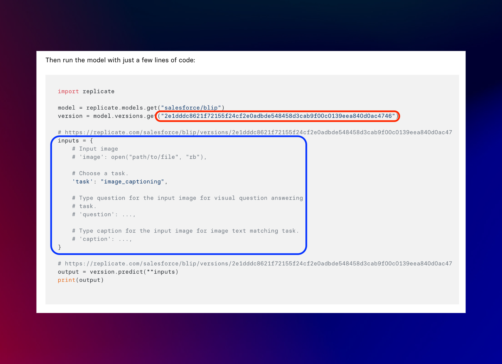 *Note: You can use Replicate for free, but after a bit you'll be asked to enter your credit card. The price varies depending on the model you use. The model we are using, salesforce/blip, costs approximately $0.00042 to run.