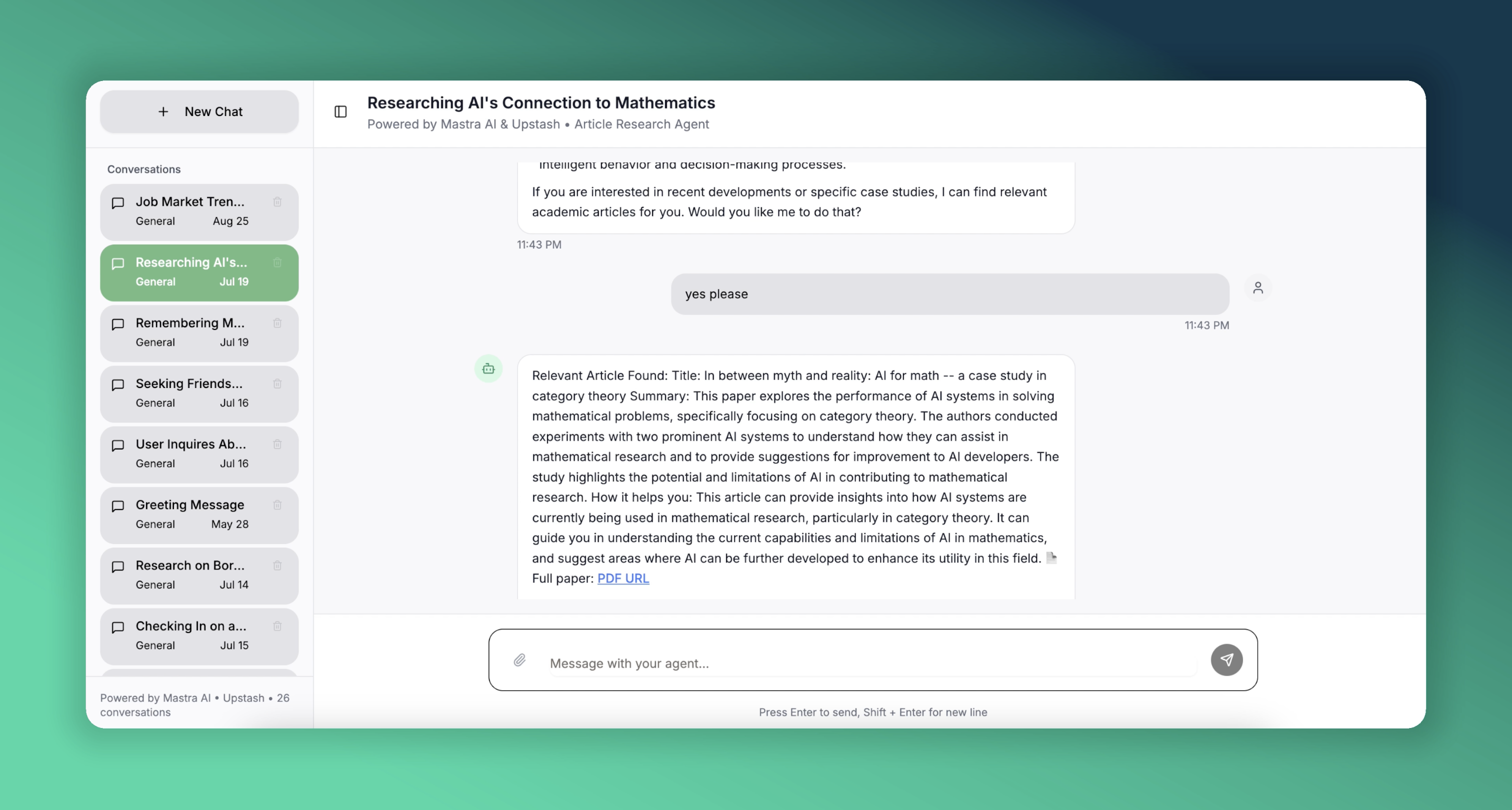 We will accomplish this with Mastra, an open-source TypeScript framework for building AI agents, and Upstash for serverless Redis and Vector storage. Here is a live demo of our article agent focused on AI research. It is deployed on Vercel for you to try out.