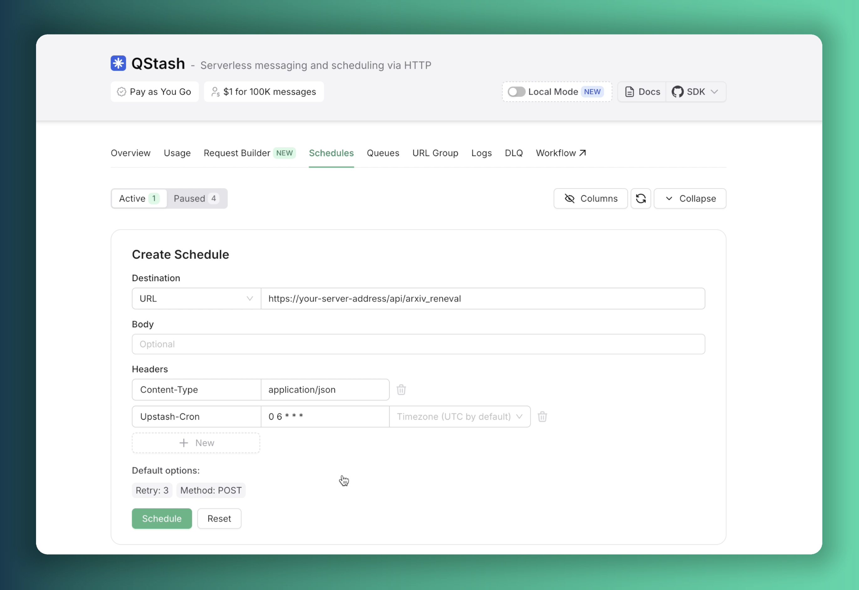 export const POST = verifySignatureAppRouter(handler)A scheduler can be configured through the Upstash Console to automatically trigger requests to this endpoint daily at 6:00 AM UTC.