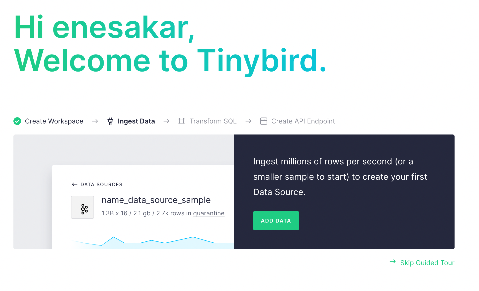 Create a Tinybird account and select a region. Create an empty workspace. On the wizard screen click Add Data button.