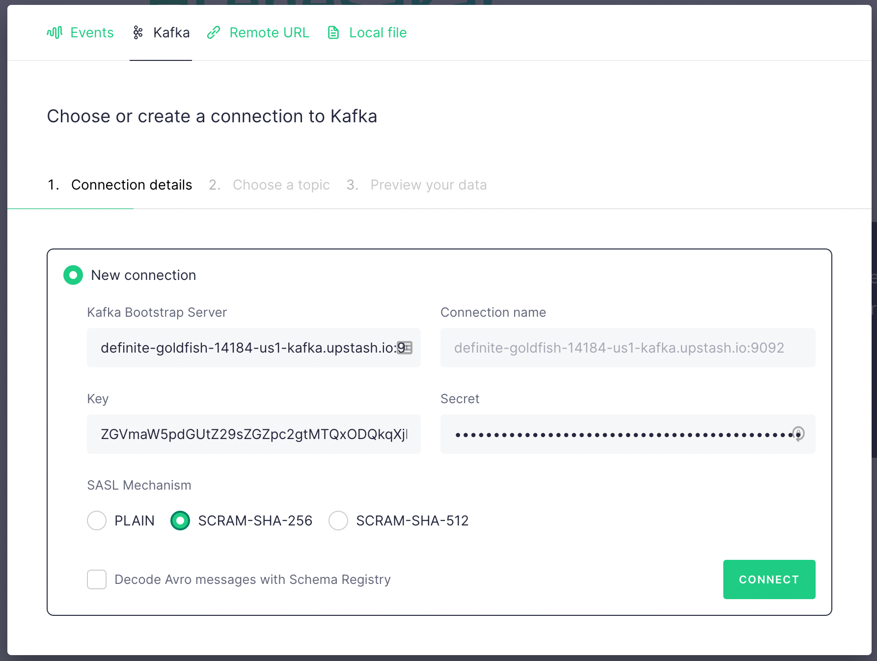In the next screen click on Kafka tab and fill the fields with the credentials copied from Upstash Kafka console. Key is username , secret is password . Select SCRAM-SHA-256. Then click on Connect button.