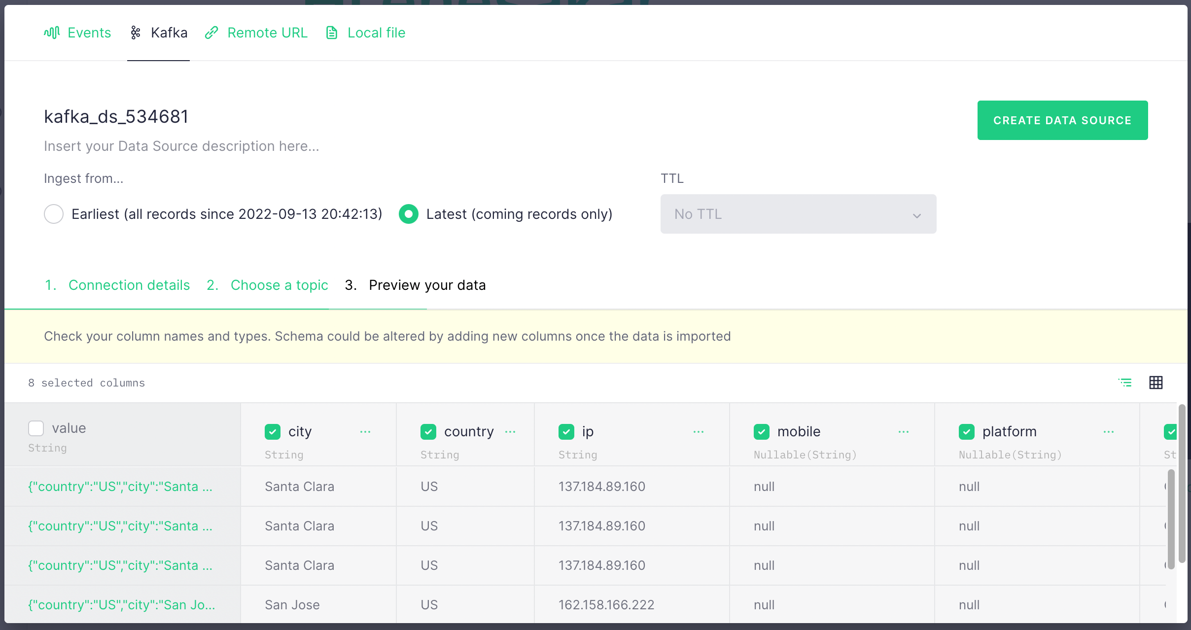 In the next screen, you should see data is populated from your Kafka topic. It should look like the below. Select Latest and click Create Data Source