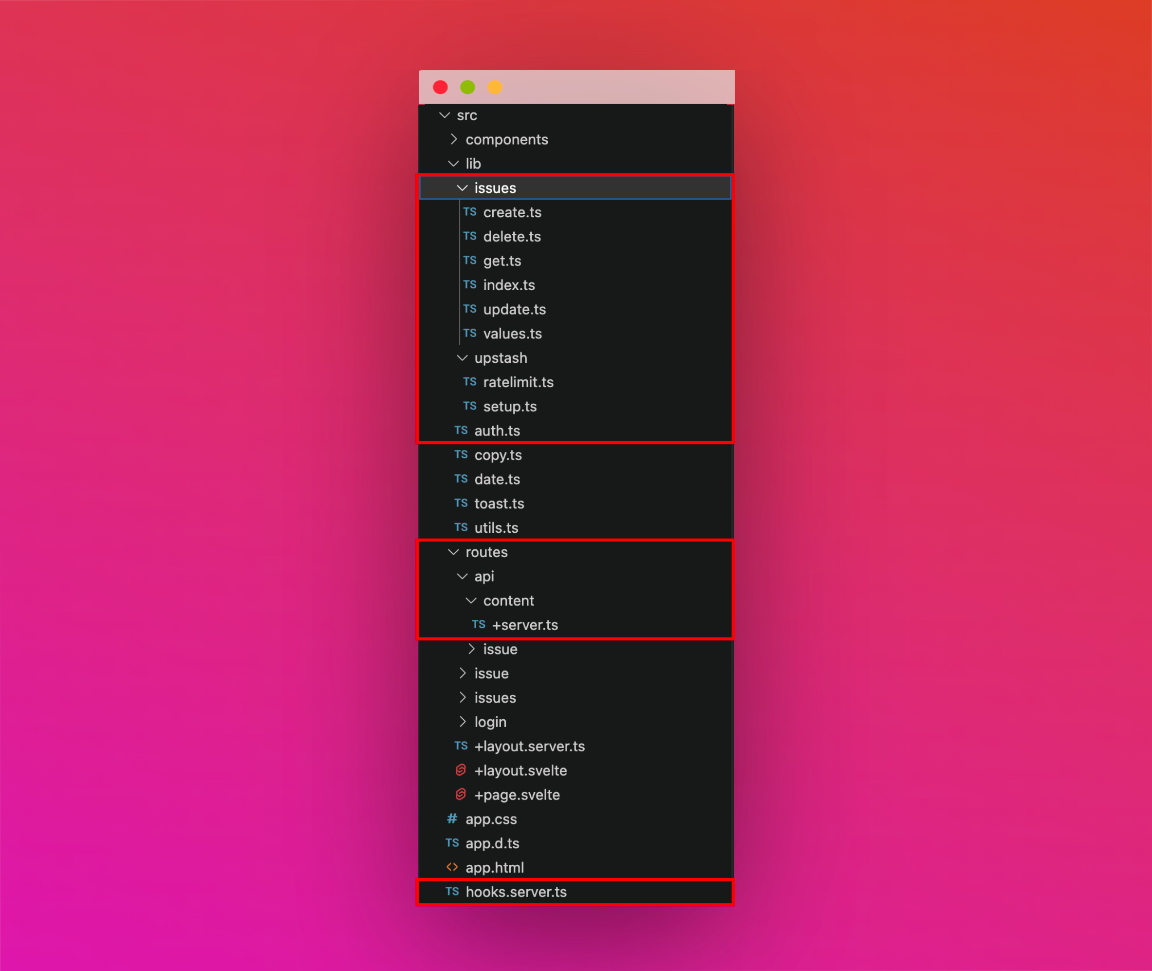 This is the main folder structure for the project. I have squared in red the files that will be discussed further in this post that deals with CRUD Operations, SvelteKit Auth, and File Upload Handler, with the files they are referenced in.