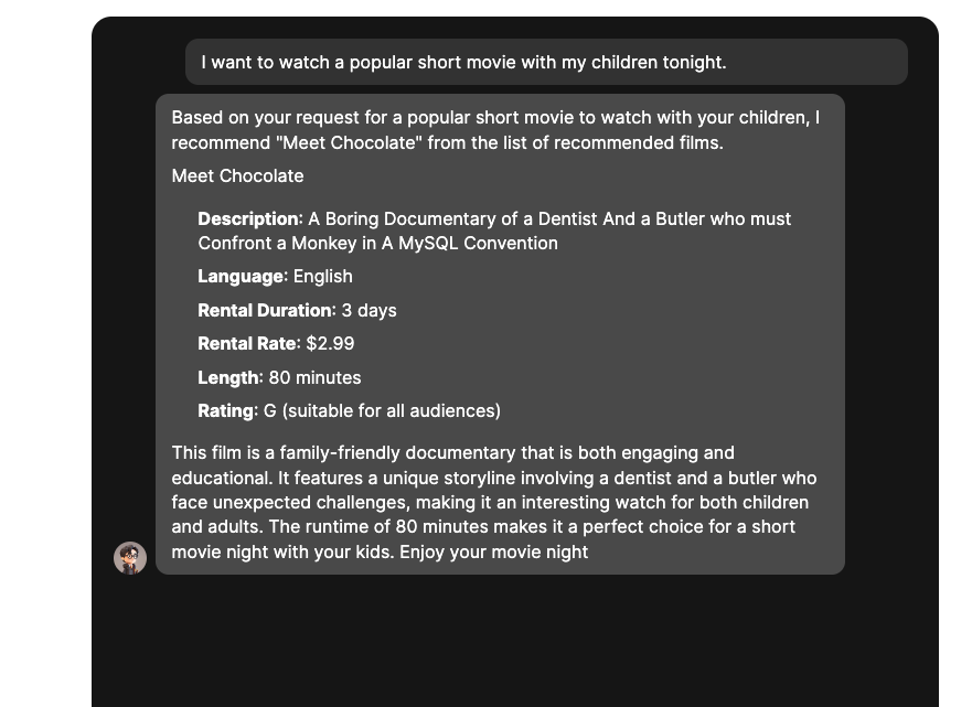 Let’s try one of our sample prompts and see what our movie recommendation bot recommends: