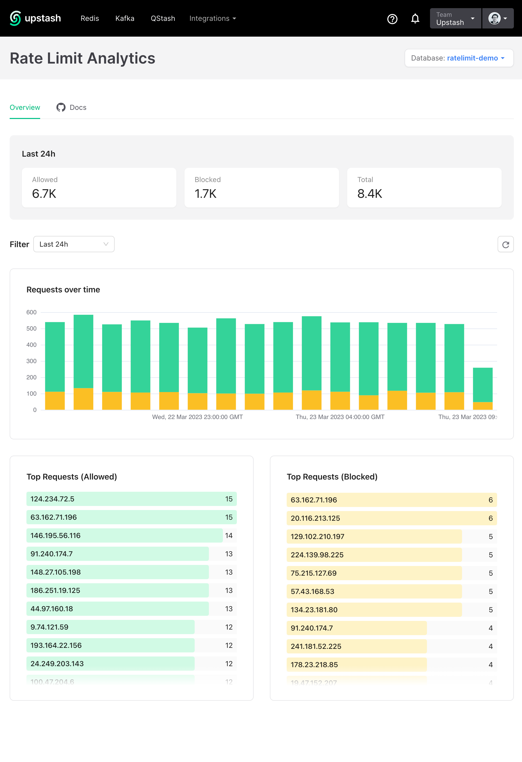 Once you've enabled analytics, you can access the Rate Limit Dashboard by visiting console.upstash.com/ratelimit. From there, you can select the database you're using for rate limiting and start monitoring.