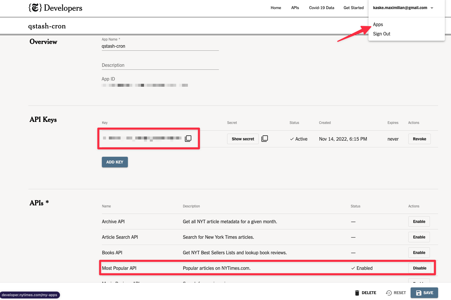 $ npm run devTo access the New York Times API, you'll need to create an account at developer.nytimes.com and create an App to access the API key. Be aware that your API is restricted by default. Enable the “Most Popular API”.