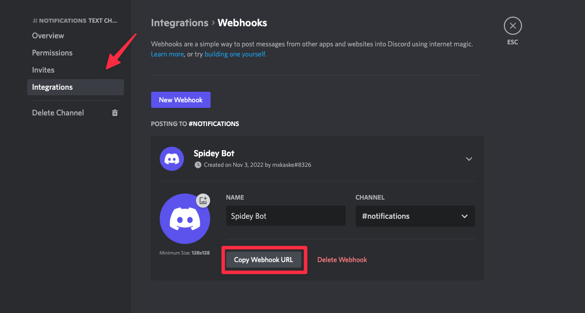 For Discord, you can select the “Edit Channel” button and go to “Integrations > Webhooks” directly inside the App to “Copy [the] Webhook URL”.