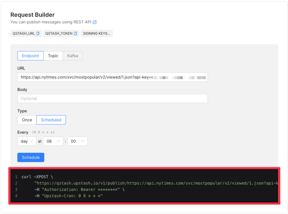 curl -XPOST "https://qstash.upstash.io/v1/publish/https://api.nytimes.com/svc/mostpopular/v2/viewed/1.json?api-key=your-key" \