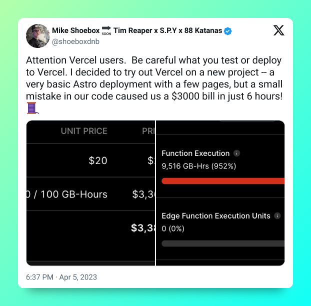 In short, they've received a massive bill for exceeding their included function execution amount. As it turns out, this was totally avoidable and is more of a usage than a Vercel issue, but we'll get to that in a second.
