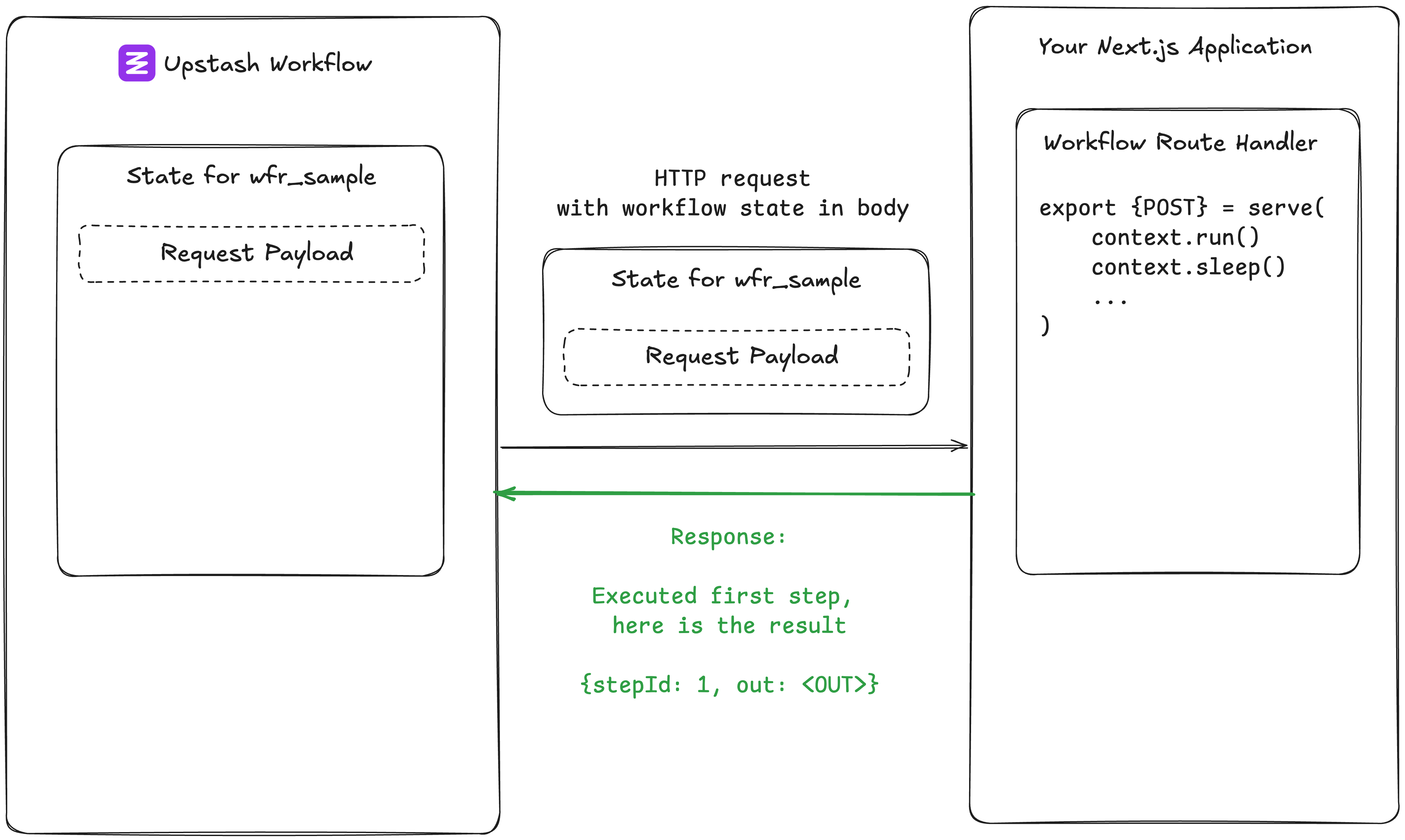 Upstash takes care of the outbound call. Once it gets the response, it stores it in the workflow state and then triggers the next step by making a new HTTP request to your app, now with the external call's result.