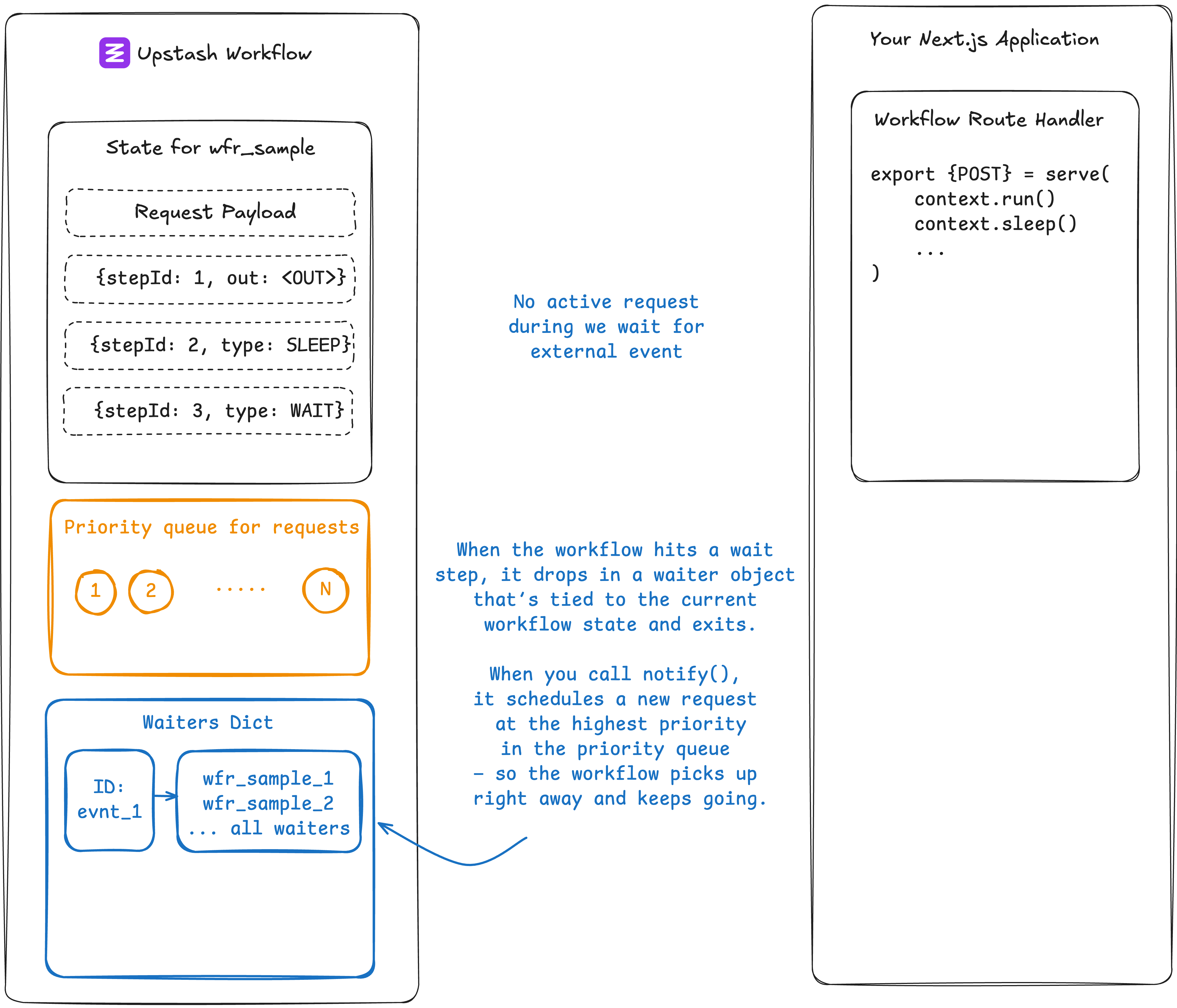 When your workflow hits a waitForEvent step, it exits but tells Upstash: “Pause here and wait for event XYZ.”